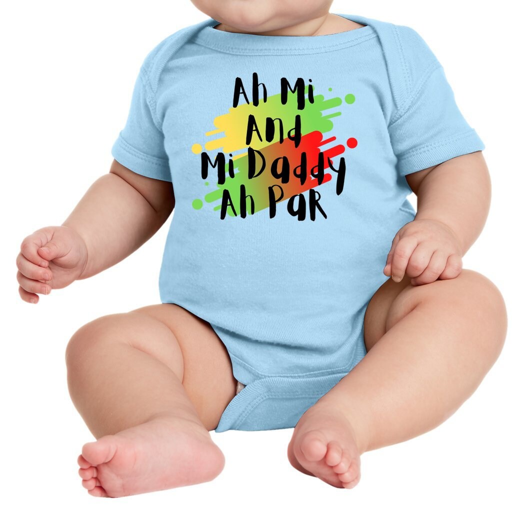 This Jamaica Baby Rib Bodysuit is outstanding as the most basic garment for your baby's wardrobe once they learn how to move and walk independently. It will act smoothly and never cause irritation due to its 100% combed ringspun cotton makeup. Ah Mi and Mi Daddy Ah Par Jamaican Saying Onesie meaning "Me and my Dad is hanging out today"