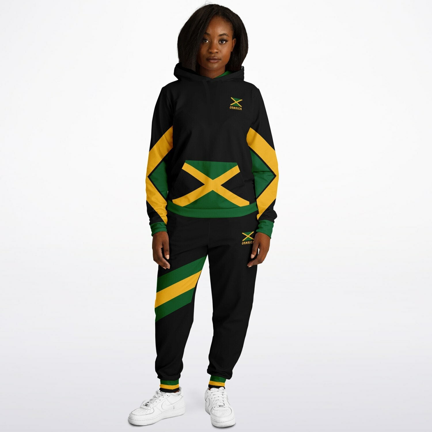 Channel yaad style with the Jamaica Pullover Hoodie & Jogger Set. Made with a soft, eco-conscious blend of 20% cotton, 75% recycled polyester, and 5% spandex for warmth and everyday comfort. Built for Champs track meet weekends, Negril nights, and island road trips-color that stays true wear after wear.