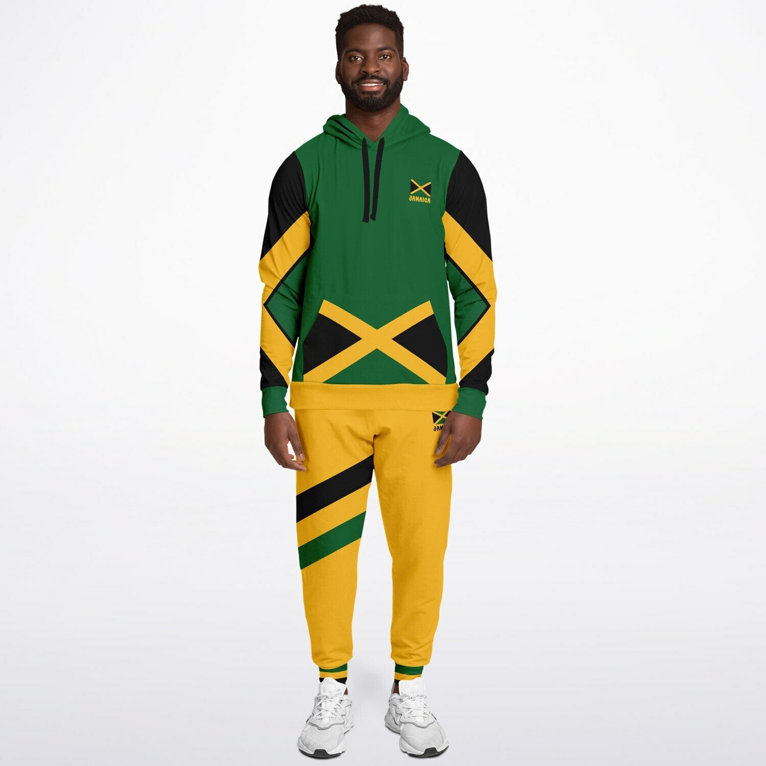 Channel yaad style with the Jamaica Pullover Hoodie & Jogger Set. Made with a soft, eco-conscious blend of 20% cotton, 75% recycled polyester, and 5% spandex for warmth and everyday comfort. Built for Champs track meet weekends, Spanish Town nights, and island road trips-color that stays true wear after wear.