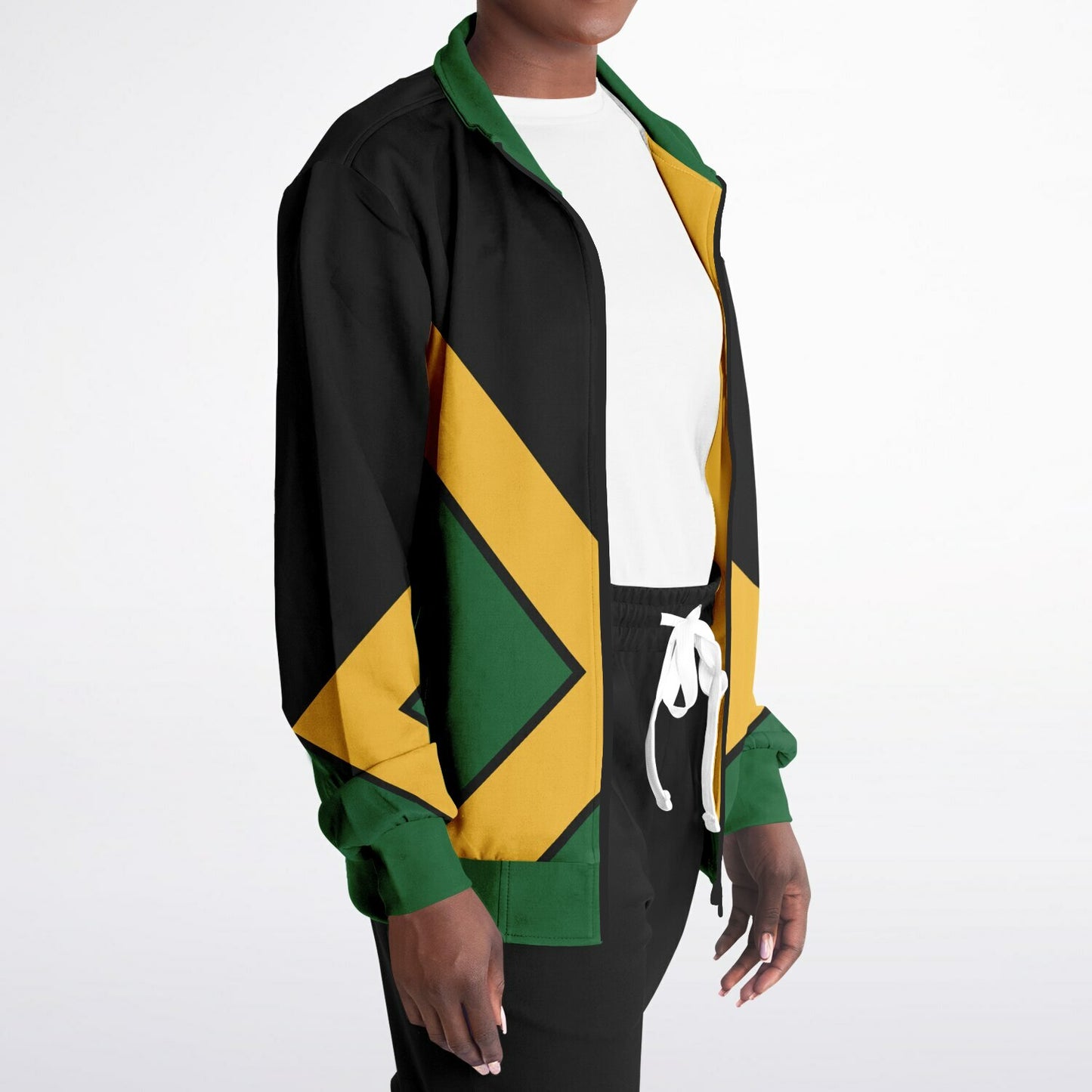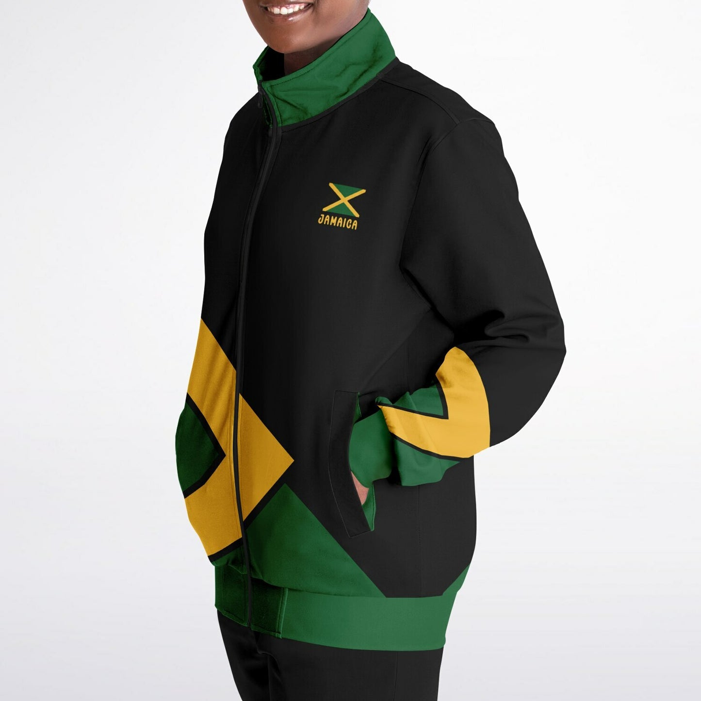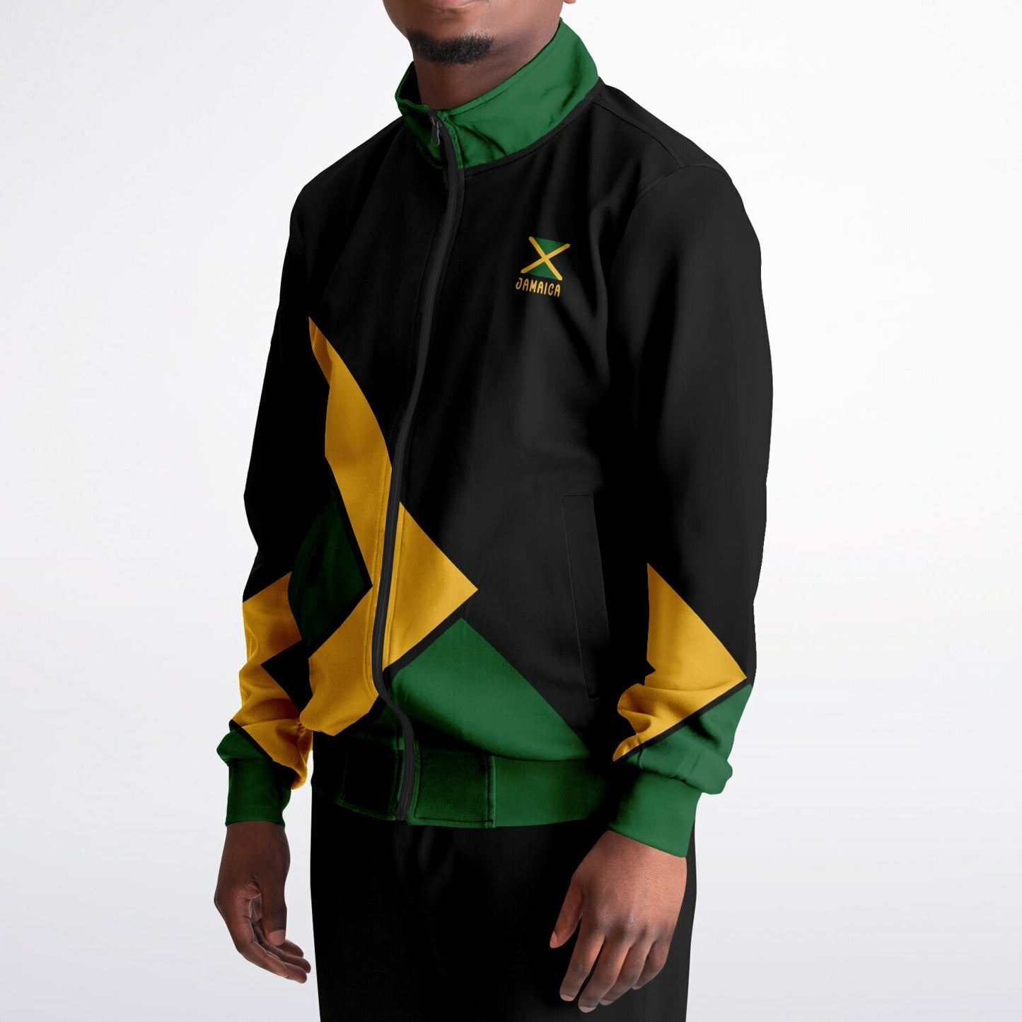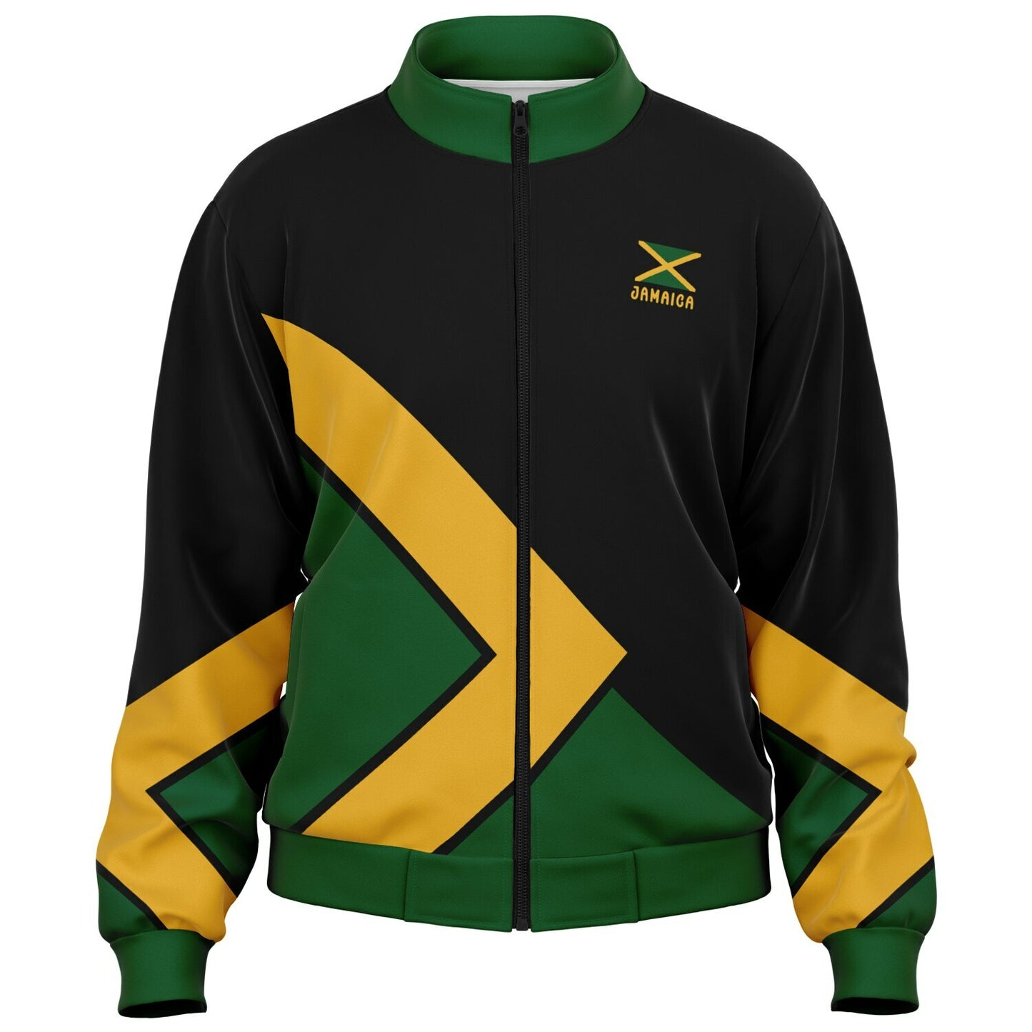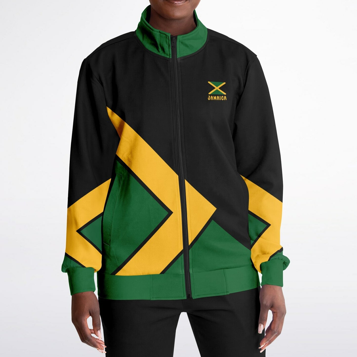 Our Jamaica Track Jacket will elevate your style and support sustainability.  Our Jamaica Tracksuit Top and is crafted from 95% recycled polyester and 5% spandex. This Jamaica track jacket offers a perfect blend of comfort, durability, and eco-conscious design. The smooth, soft fabric feels great against the skin, while the high-definition colors stay vibrant through daily wear.