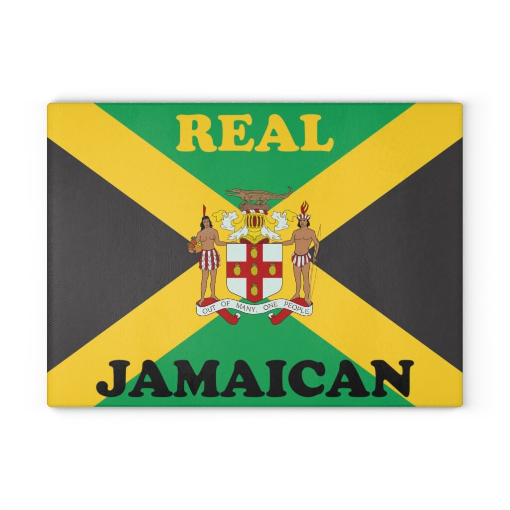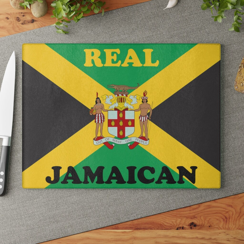 Bring a touch of character into any kitchen with this custom Jamaican glass cutting board. Its tempered glass material is robust and helps prepare many a tasty meal for a long time to come. The textured surface makes it an ideal chopping, slicing, and dicing area. The design features the Jamaican Flag and Coat Of Arms. The perfect item to spruce up your kitchen with a touch of home always in sight. Purchase your Jamaican cutting board today!!