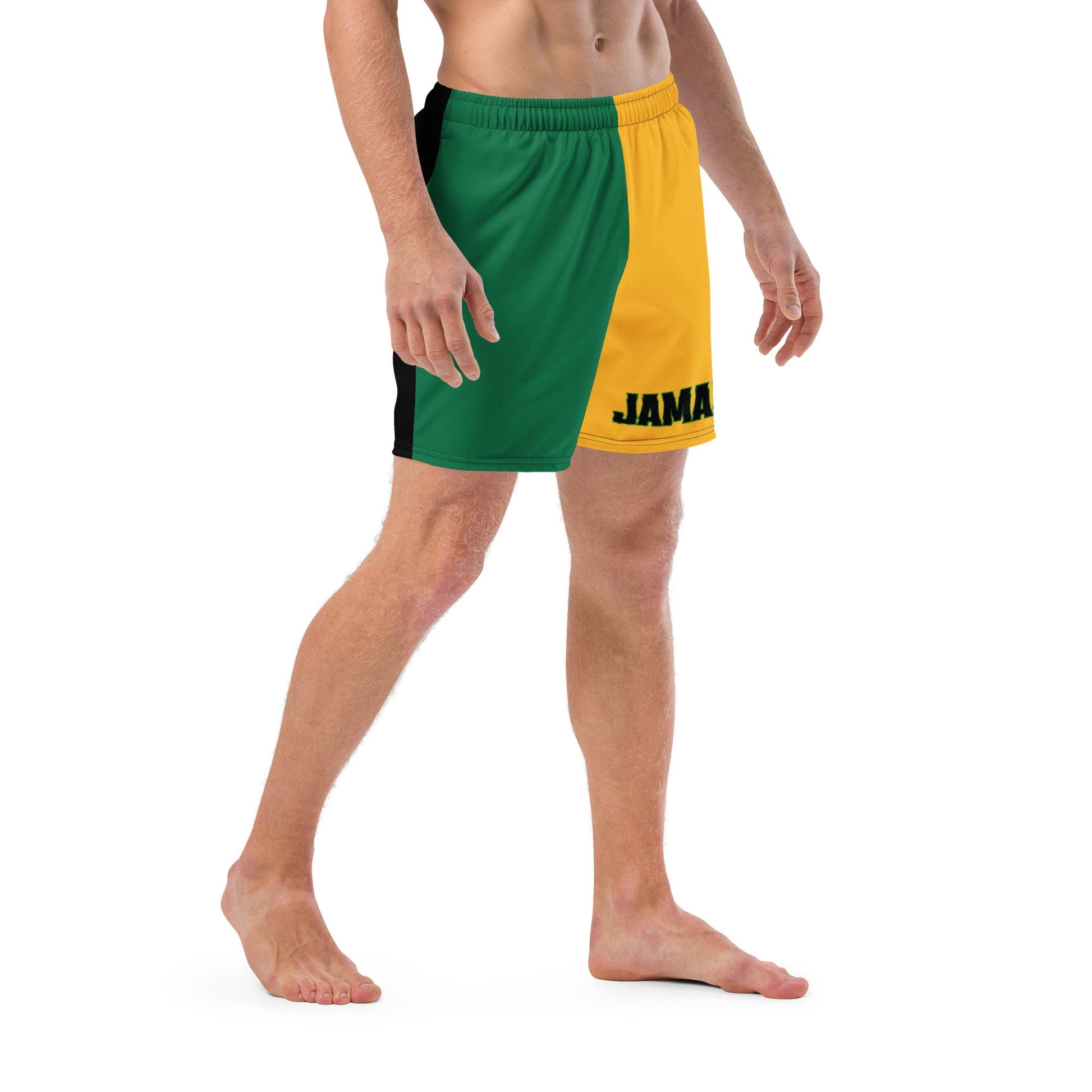 These Jamaica Flag swim trunks / athletic shorts have everything you need for a hot summer daytheyre quick-drying and breathable, have multiple pockets for your belongings, and feature a silky, anti-chafe inner liner. Get yours now because Out of Many, One People!