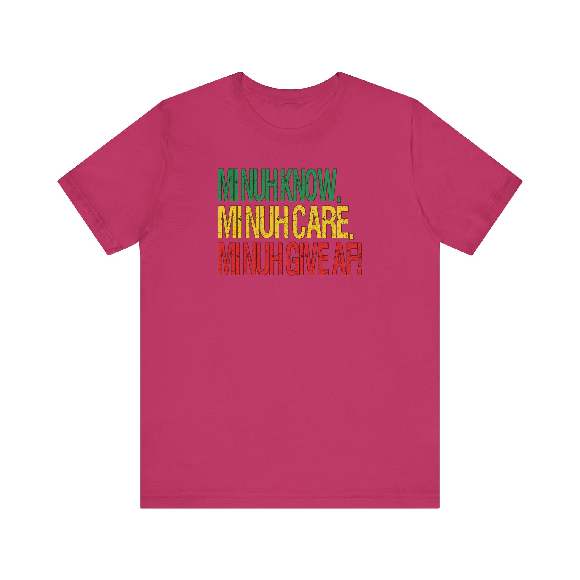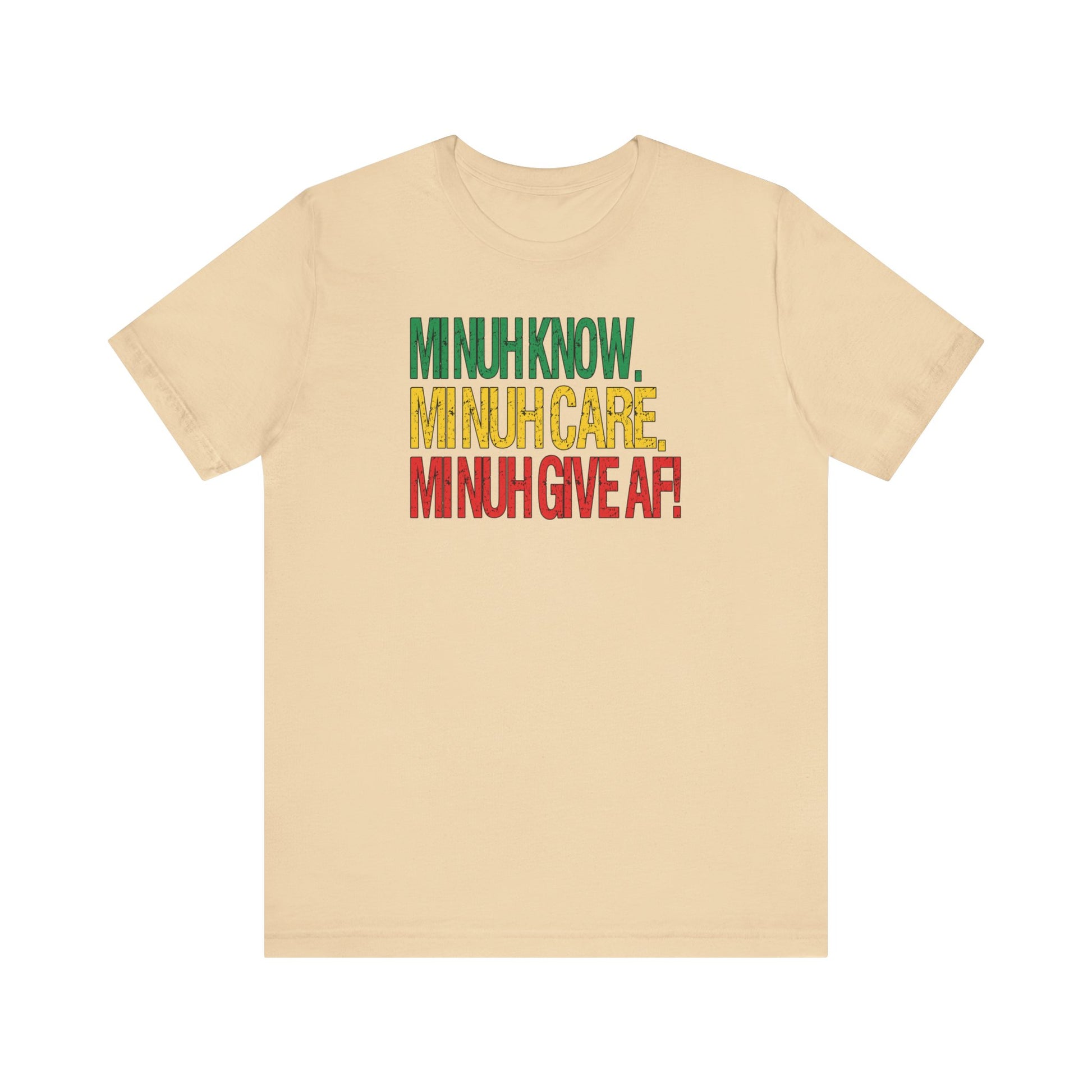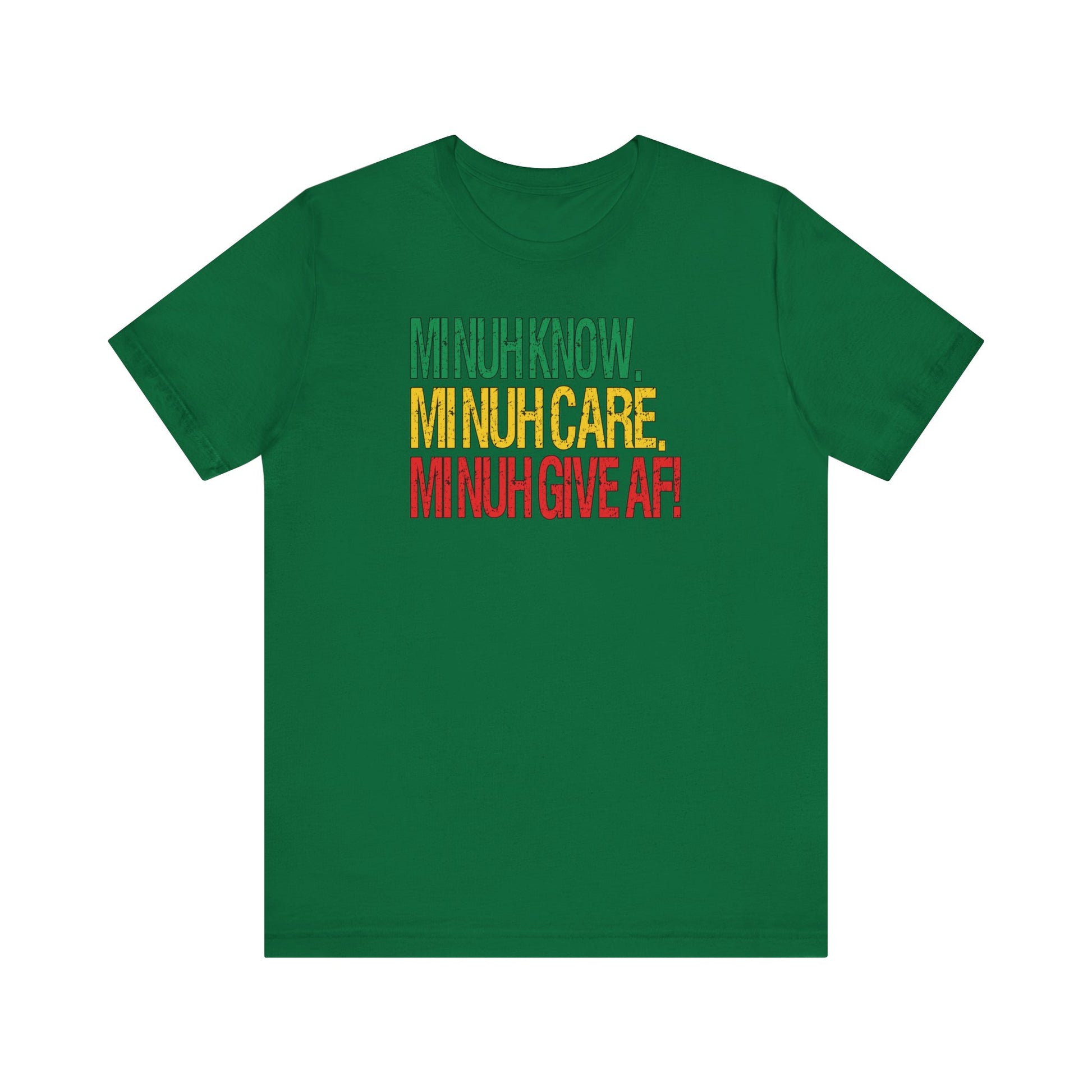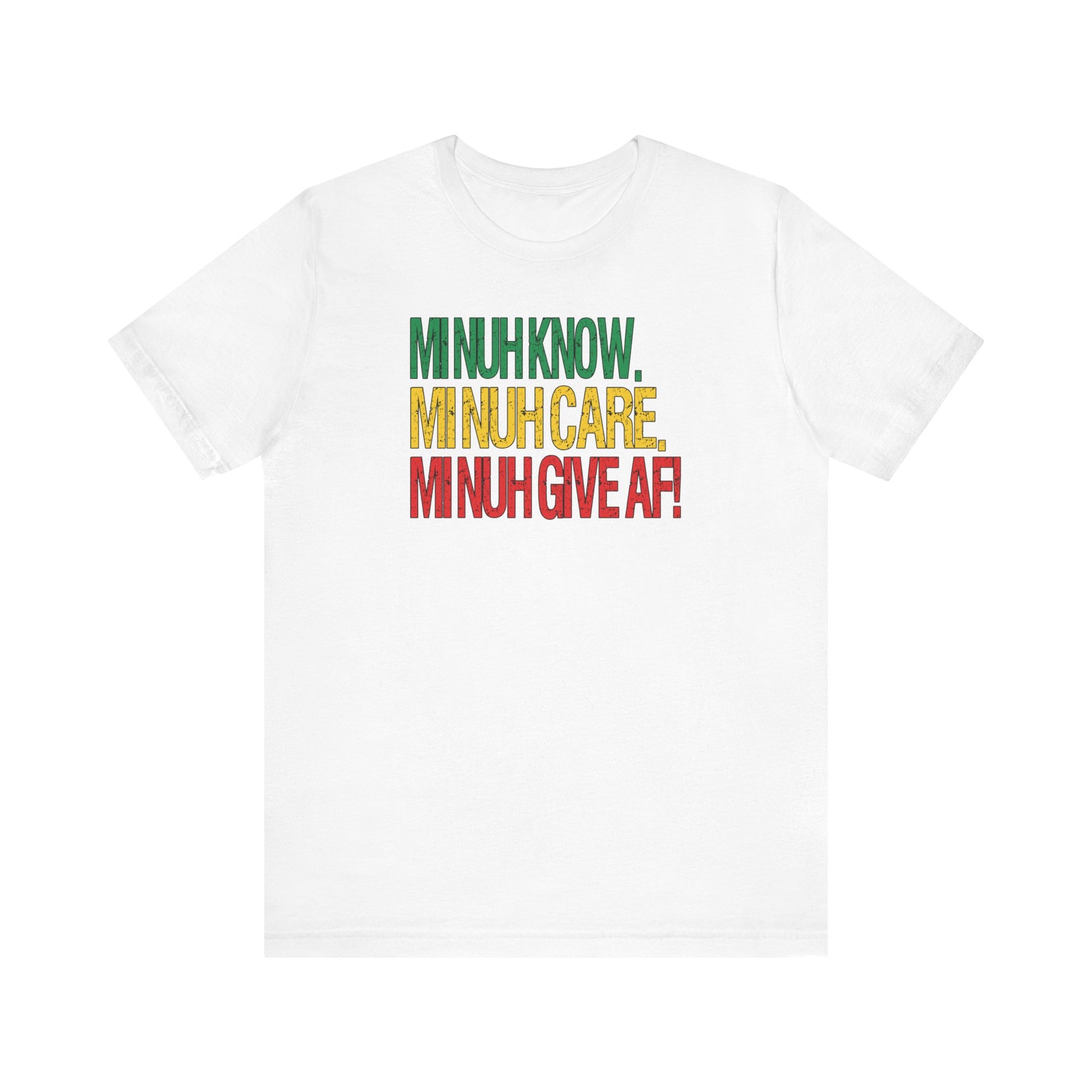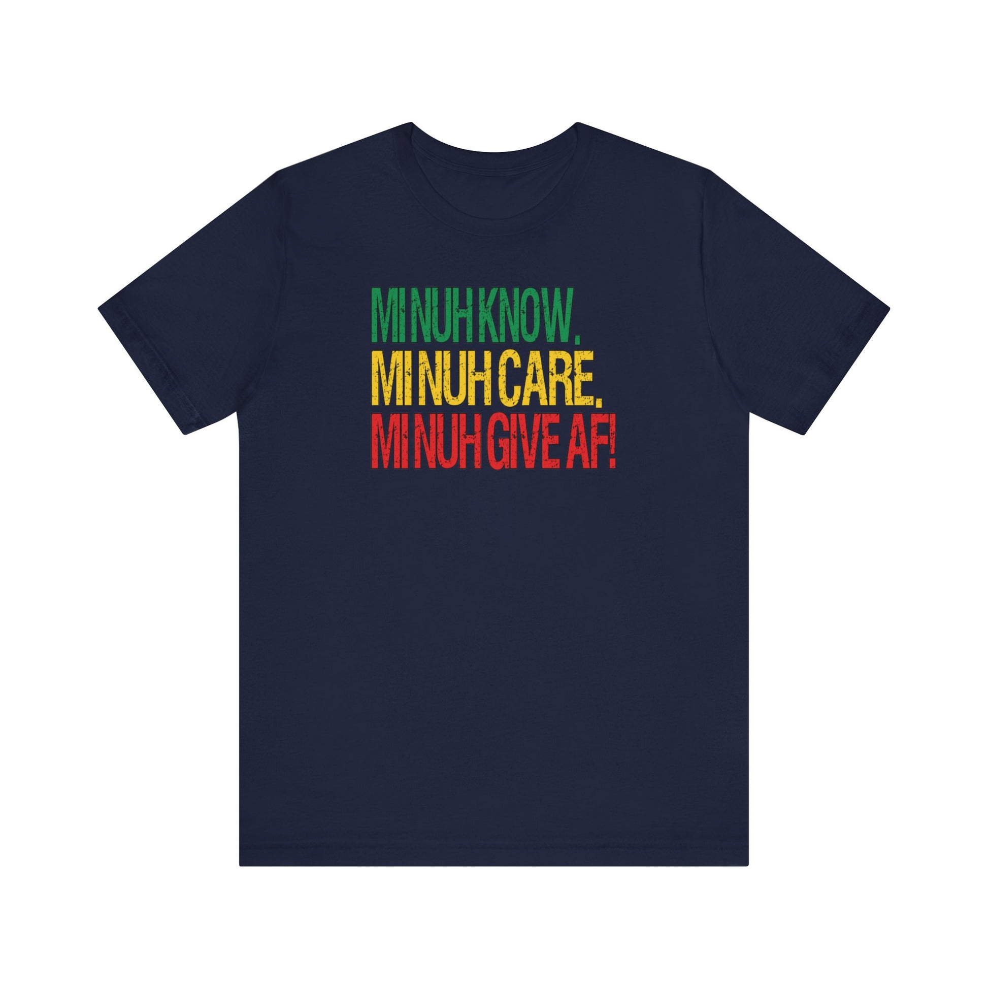 Embrace the Rasta Spirit: This vibrant Rasta T-Shirt features the unapologetic "Mi Nuh know, Mi Nuh Care, Mi Nuh Give AF!" slogan, radiating positive rebellion in classic Rasta colors.