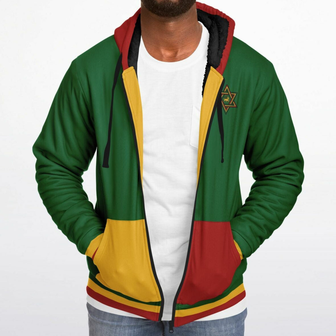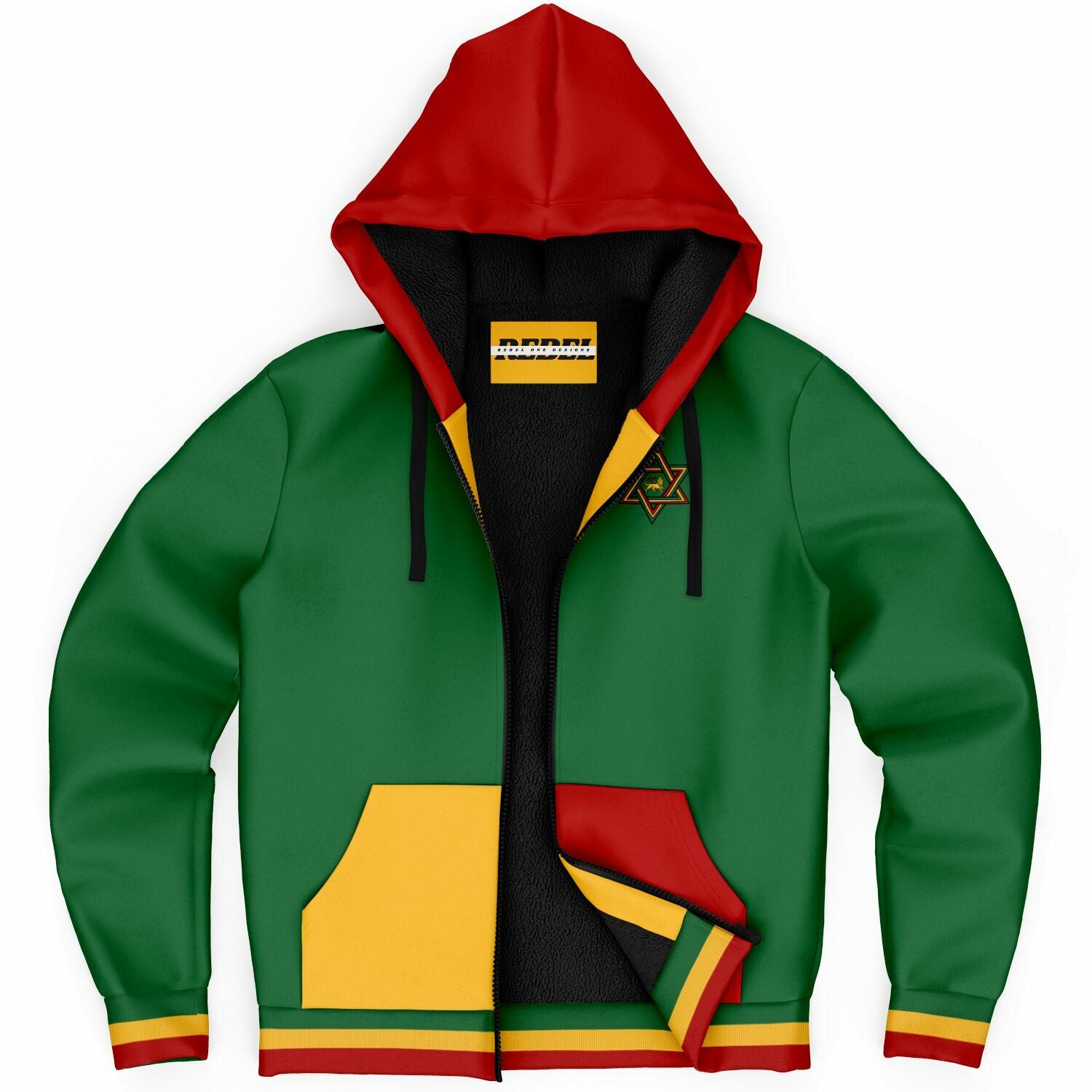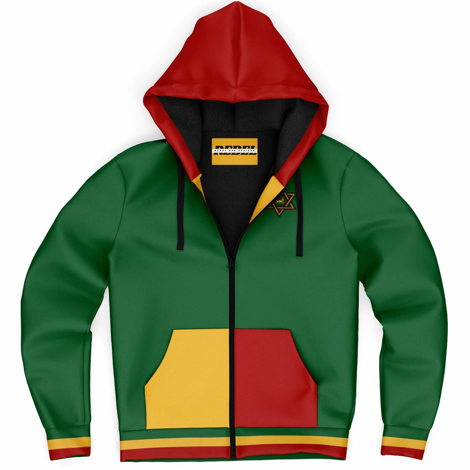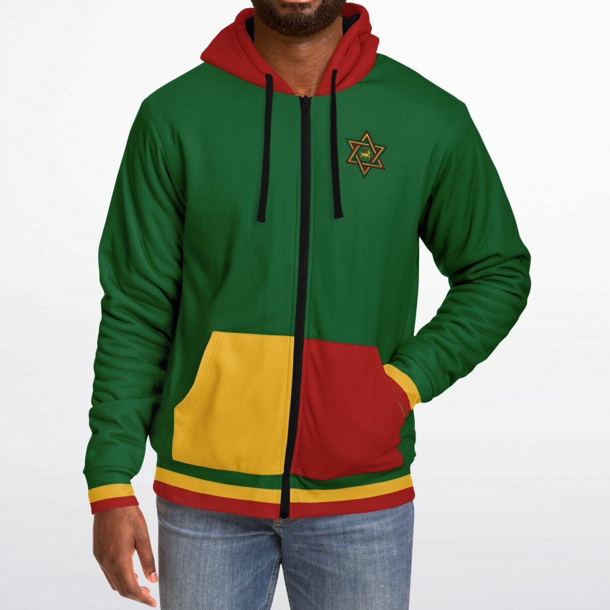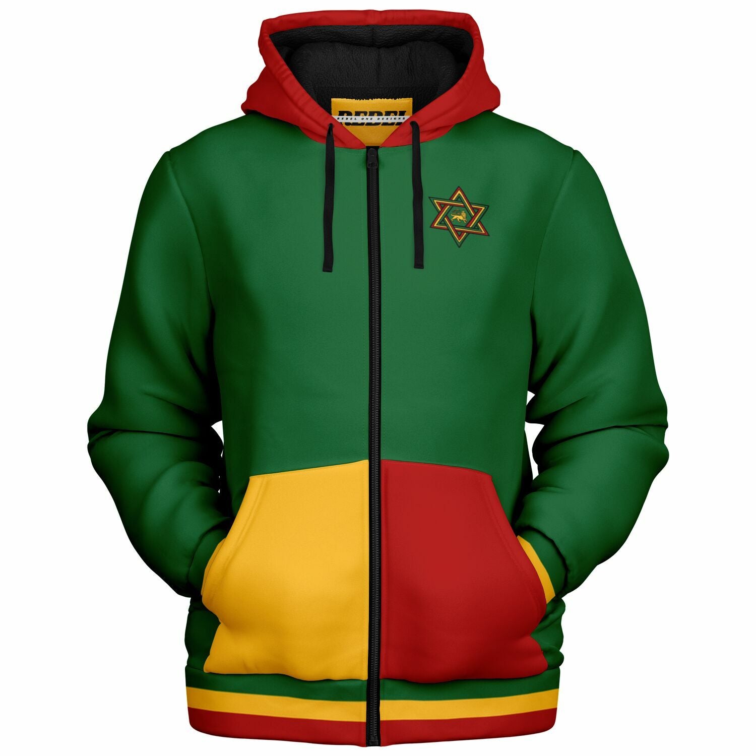 Our Rasta zip up hoodie features a soft and durable 100% Recycled Polyester fabric. The microfleece lining on the inside will make this your favorite and most comfortable hoodie yo own. Our Rasta Hoodie offers a perfect blend of comfort, durability, and design. The smooth, soft fabric feels great against the skin, while the high-definition colors stay vibrant through daily wear.