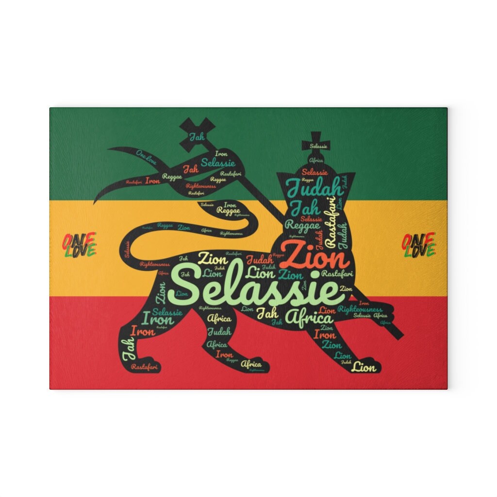 Bring a touch of character into any kitchen with this custom Lion of Judah Rastafarian inspired glass cutting board. Its tempered glass material is robust and helps prepare many a tasty meal for a long time to come. The textured surface makes it an ideal chopping, slicing, and dicing area. The design features the Ethiopian Flag, and the Lion of Judah. The perfect item to spruce up your kitchen with a touch of home always in sight. Purchase your rastafarian inspired serving board today!!
