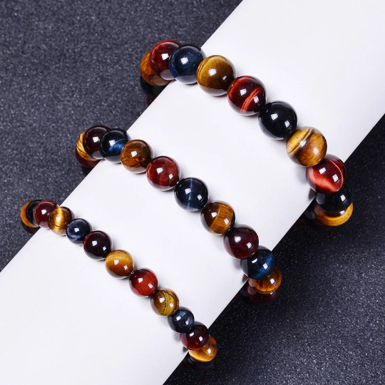 Channel inner strength and achieve balance with our Tri-Color Tiger Eye Bracelet. Handcrafted with love, this stunning piece combines the powerful attributes of blue, red, and yellow Tiger Eye stones, promoting balance, strength, and mental clarity. It's not just a jewelry—it's a statement of intent, a commitment to personal power and a balanced spirit.